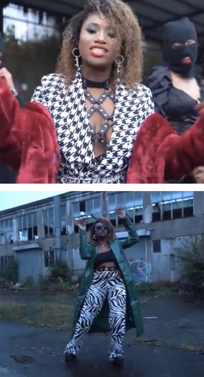 The Manchester-born was known on the show for her brightly coloured outfits which she follows through within the video. In the opening scene, we see Ice in a dogtooth printed suit, with a leather chained choker which she then switches up into zebra printed trousers, a black bandeau and a long green coat. Ice wasn't playing with her costume choices which stood out with the scene aesthetics of a warehouse and street.
